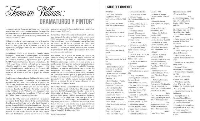 Concebida por la galerista norteamericana Nance Frank –quien gustosamente propuso el disfrute de la cultura acumulada por prestigiosos artistas de la comunidad de Cayo Hueso– se presentaron cuatro obras plásticas de la autoría de Tennessee William